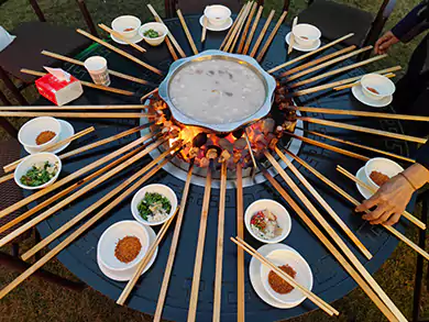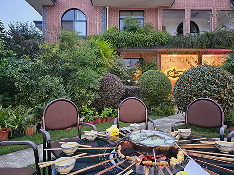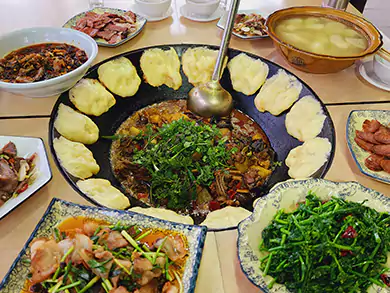 为保证鸡肉品质,本店柴火鸡套餐均采用7斤以上的果园散养跑山鸡,7~8人套餐为一整只约7斤毛重鸡,净重约5斤,9~10餐为8斤左右活鸡,净重约6斤;4~5人小份套餐则为大半只鸡,净重约3.6斤,相当于5.5斤的活鸡。套餐默认素菜搭配:土豆,四季豆,香菇,木耳四种素菜,如需其他配菜需提前一天预定告知。套餐附赠锅边馍一份,泡椒鸡杂一份,鸡血汤一份,米饭。