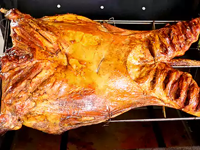 本店烤全羊全部采用屠宰场新鲜全羊,故整只净重普遍在40斤左右(相当于毛羊80斤),肉多且肉质肥美,可供30~50人团队使用,烤全羊本店赠送有羊杂萝卜汤,生菜,泡菜,同时也可搭配竹签烧烤供更多人使用,也让菜品更加丰富。注意:由于本店全羊较大,人少可以选择半只,推荐约20人用餐。由于固定成本影响故整只价格与半只价格有所差异。